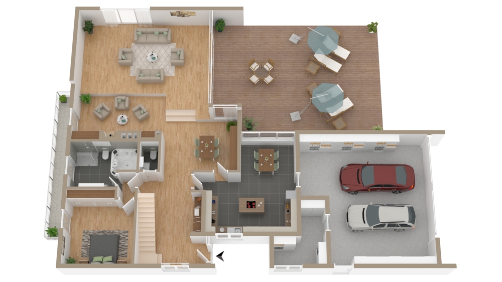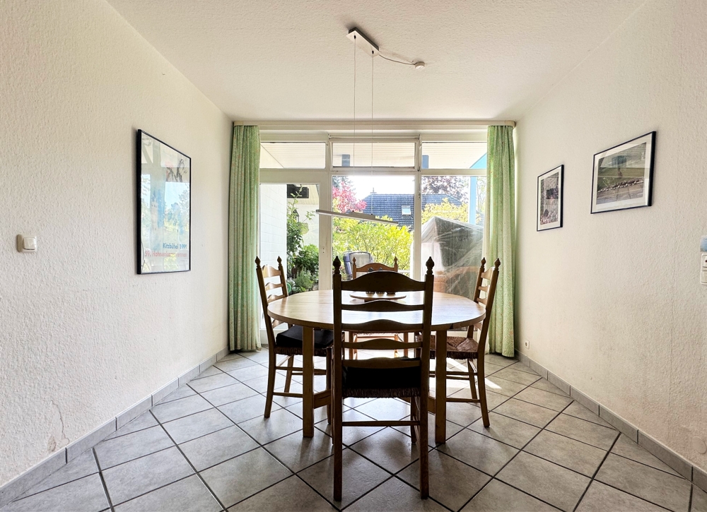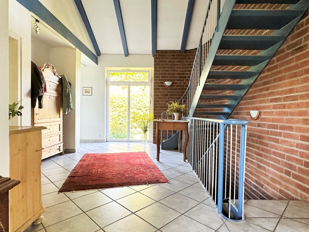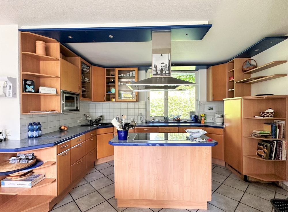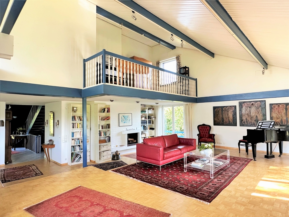 Im Erdgeschoss erreichen Sie über den hellen Eingangsbereich den großen, lichtdurchfluteten Wohn-/Essbereich, den Küchenbereich als auch das Schlaf- und Badezimmer. Der Wohn-/Essbereich ist optisch in zwei Sektionen separiert. Umrahmt von großen Fensterfronten präsentiert sich Ihnen der helle Wohnbereich, mit direkten Gartenzugang über weit-öffnende Panoramatüren. Hier können Sie den Blick schweifen lassen oder tolle Stunden am offenen Kamin genießen. Etwas zurückgezogen und deutlich näher an der Küche gelegen befindet sich der Essbereich. Die geschmackvolle Küche mit Kochinsel ist voll-ausgestattet und besitzt einen kleinen separaten Essbereich mit ebenfalls direktem Zugang zum Garten. Im Erdgeschoss befinden sich auch ein Gäste-WC, das Hauptbadezimmer mit großer Badewanne und Dusche als auch das Schlafzimmer. Schlafzimmer, Badezimmer als auch Kaminbereich haben Zugang zu einem Richtung Felder liegenden Balkon.
