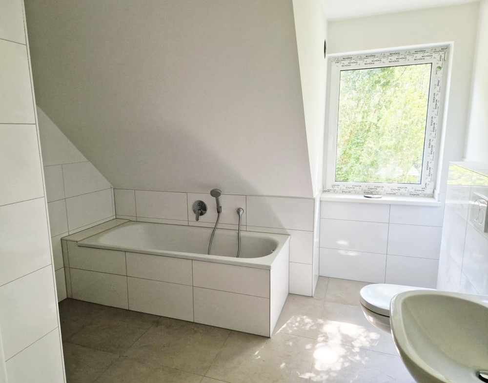 Das Obergeschoss erreichen Sie über eine schöne Holztreppe. Hier befinden sich das Elternschlafzimmer und zwei weitere Schlafzimmer/Arbeitszimmer. Das Vollbad ist mit Wanne und bodentiefer Dusche ausgestattet und in freundlichem Weiß gehalten.
