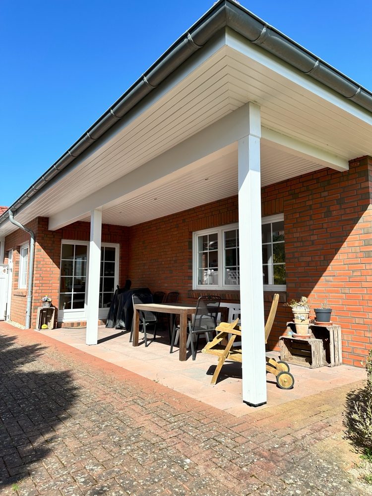 Die gemütliche, überdachte Terrasse lädt dazu ein, entspannte Stunden im Freien zu verbringen.