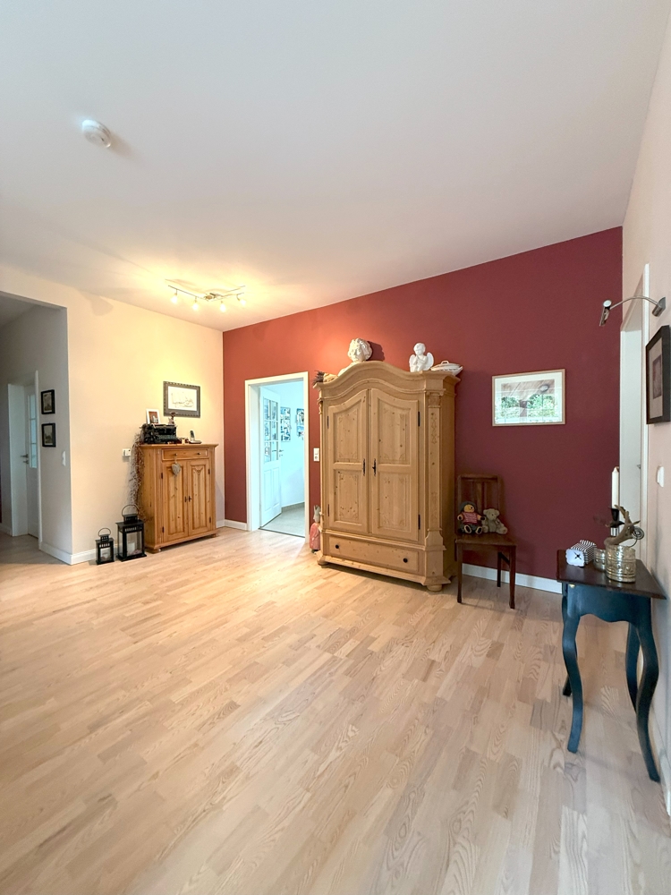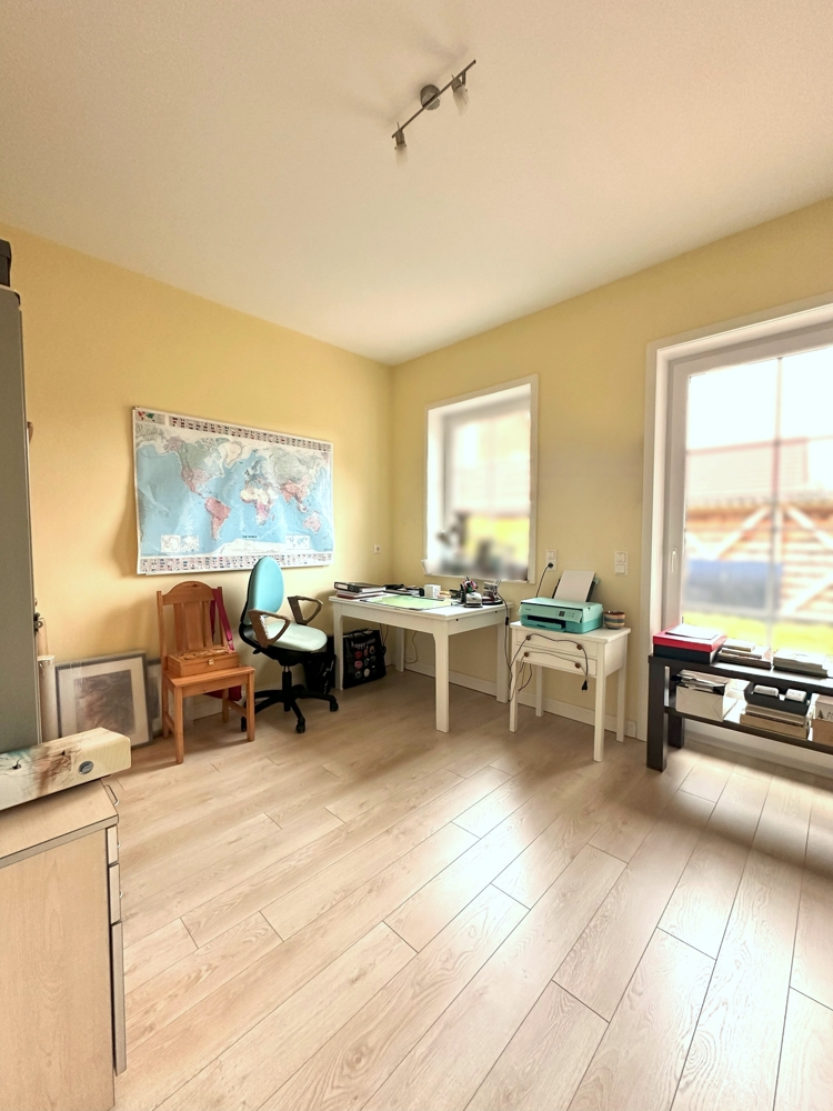 Vom ersten Wohnflur aus erreichen Sie zwei weitere Zimmer, die sich hervorragend als Kinder- oder Arbeitszimmer nutzen lassen. Zudem stehen Ihnen ein weiteres Badezimmer und ein geräumiger Hauswirtschaftsraum zur Verfügung, der nicht nur praktische Funktionen erfüllt, sondern auch einen zusätzlichen Zugang zum Haus bietet.