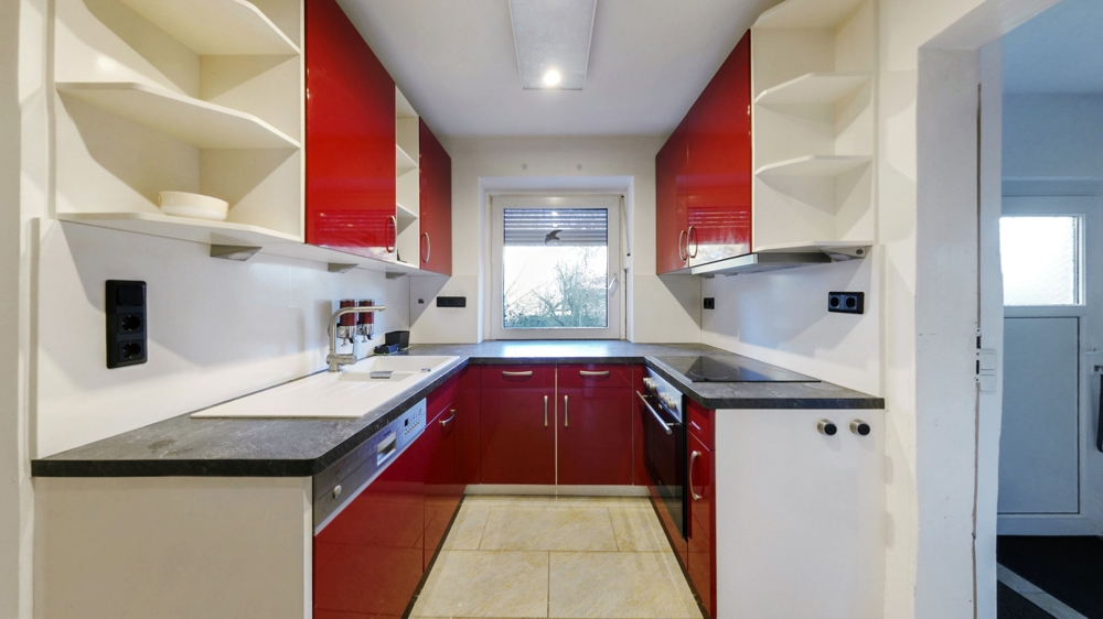 Über einen Windfang gelangt man in den Eingangsbereich, von dem aus das Gäste-WC, das große Wohn- und Esszimmer sowie die Küche erreichbar sind. Der Kaminofen im Wohn- und Essbereich schafft eine angenehme, wohnliche Atmosphäre und macht diesen Raum zu einem zentralen Rückzugsort im Haus.