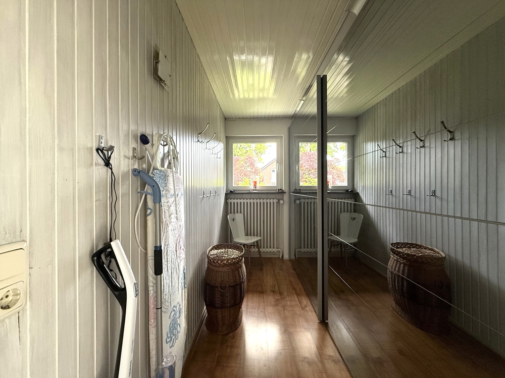 Im Erdgeschoss gelangen Sie zudem über den Flur in ein großes Schlafzimmer, ein weiteres Zimmer, das sich hervorragend als Gäste- oder Kinderzimmer eignet, sowie in ein Badezimmer mit Badewanne und ein praktisches Ankleidezimmer.