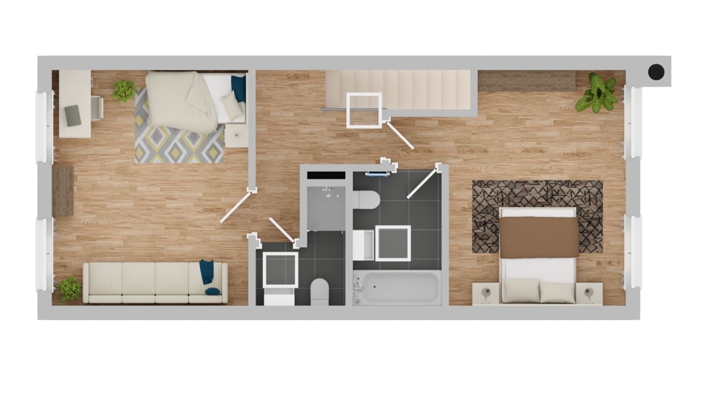 Über eine Treppe gelangen Sie in das 1. Obergeschoss, in dem zwei große helle Zimmer auf Sie warten. Diese Räumlichkeiten eignen sich ideal als Schlaf-, Kinder- oder auch als Arbeitszimmer. Eines der Zimmer bietet einen direkten Zugang zu einem Badezimmer mit Badewanne. Das weitere Zimmer lässt sich bei Bedarf durch eine Leichtbauwand in zwei kleinere Räume unterteilen – ideal für flexible Wohnkonzepte oder zusätzliche Nutzungsmöglichkeiten. Für zusätzlichen Komfort befindet sich im Obergeschoss ein weiteres Badezimmer mit Dusche.