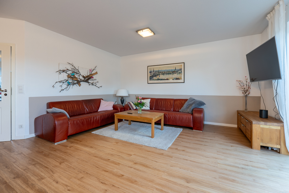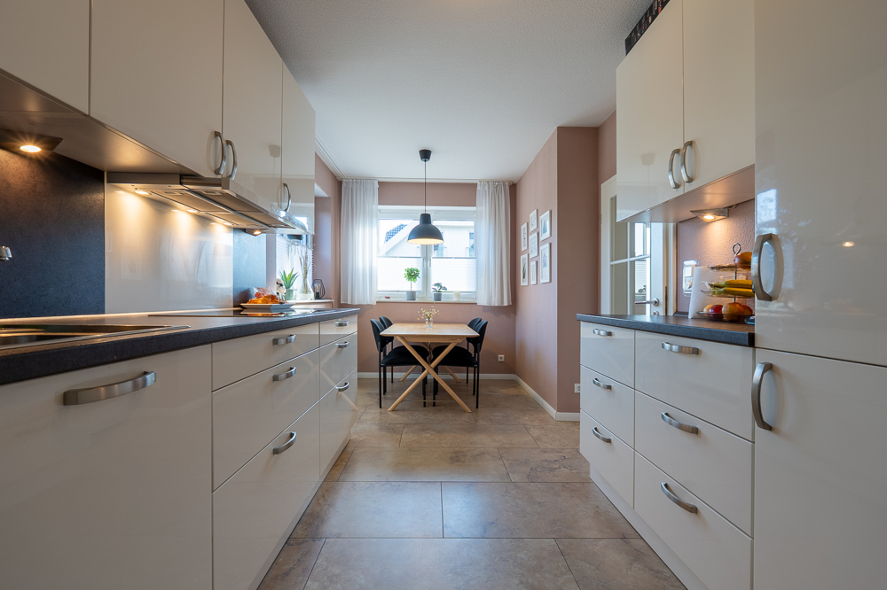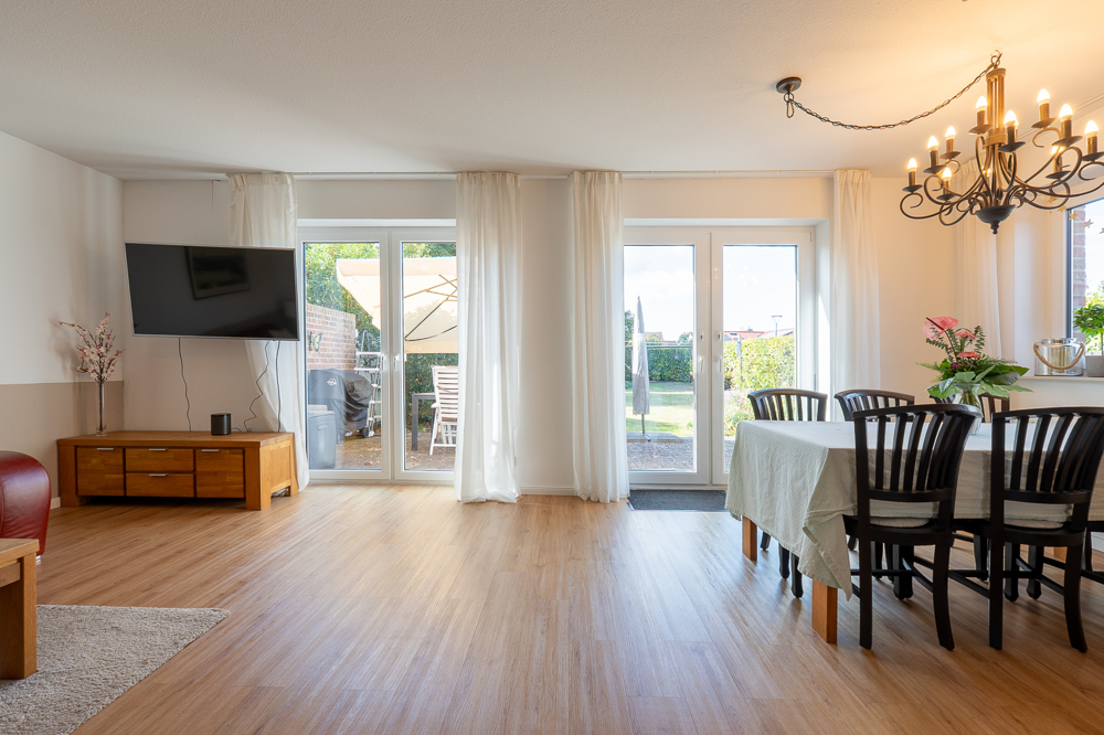 Im Erdgeschoss empfängt Sie ein großzügiger, offener Wohn-/Essbereich mit direktem Zugang zur Terrasse und in den Garten. Große Fensterflächen lassen viel Tageslicht herein und schaffen eine helle, freundliche Atmosphäre. Die Küche, mit innenliegender Schiebetür zum Wohn-/Essbereich, ist mit einer Einbauküche (mit hellen Lackfronten) aus dem Baujahr ausgestattet. Ein Gäste-WC, ein HWR und ein Abstellraum ergänzt das Raumangebot auf dieser Ebene.