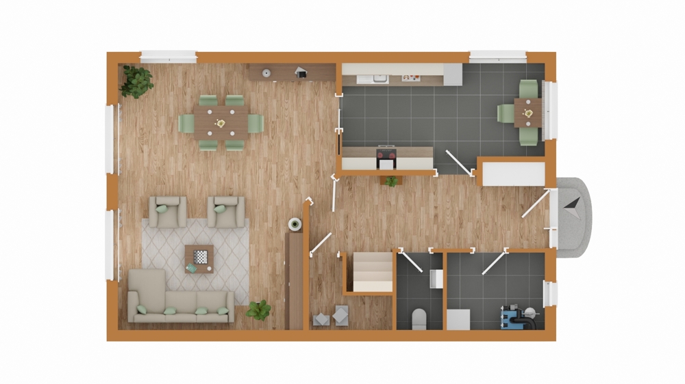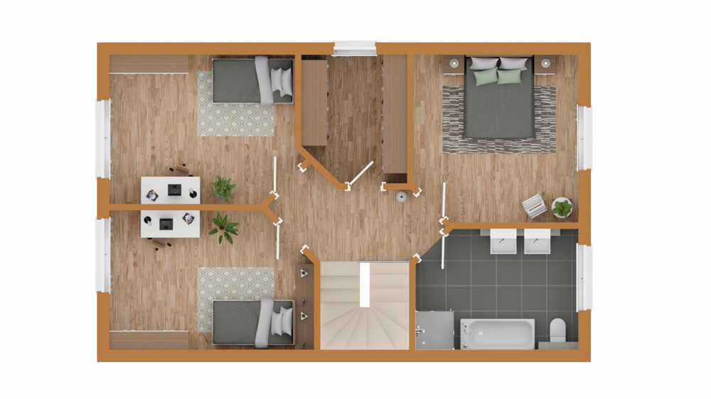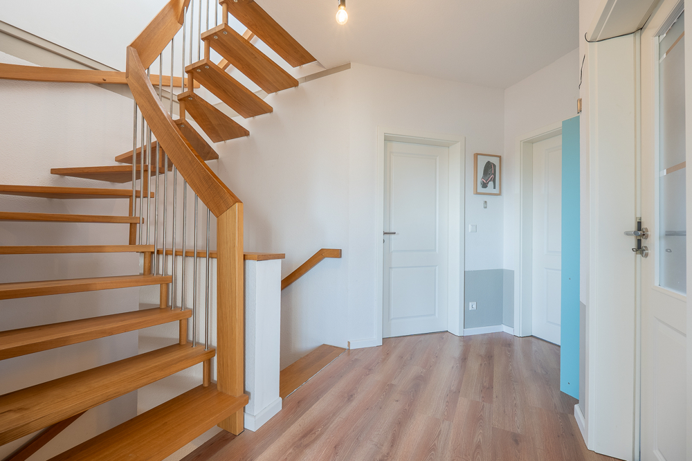 Im Obergeschoss stehen drei gut geschnittene Schlafzimmer sowie ein modernes Tageslichtbad mit großer Badewanne zur Verfügung. Zusätzlich gibt es einen weiteren Raum, der sich ideal als Ankleide oder kleines Homeoffice eignet. Außenrollos in Erd- und Obergeschoss sorgen für zusätzlichen Komfort und Sicherheit.