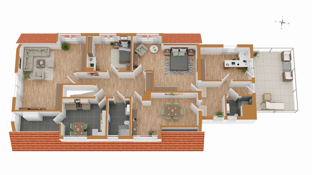 Die Vermietung der 6 Wohnungen einschließlich der beiden Garagen als auch der 5 Stellplätze erbringt aktuell eine Kalt-Miete von €4.450,00 p.m. Hinzu kommt eine durchschnittliche Einspeisevergütung der PV-Anlage von €350,00 p.m. Es ergeben sich Jahres-Netto-Einnahmen von €57.600,00. Die Durchschnittsmiete beträgt aktuell