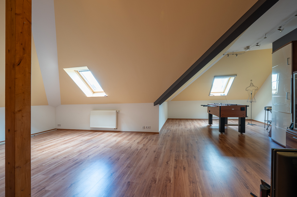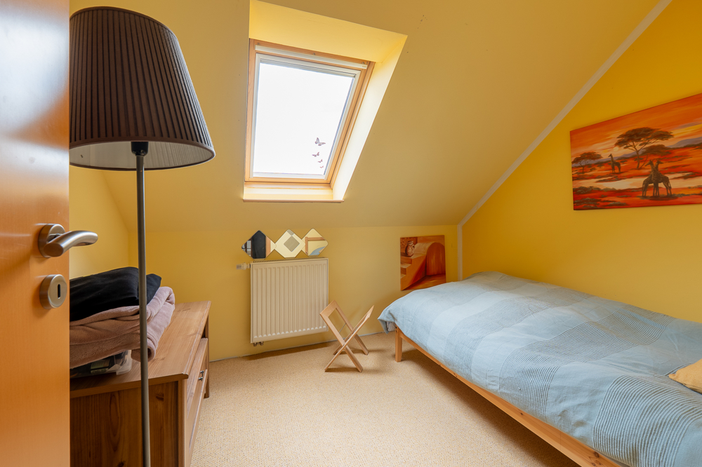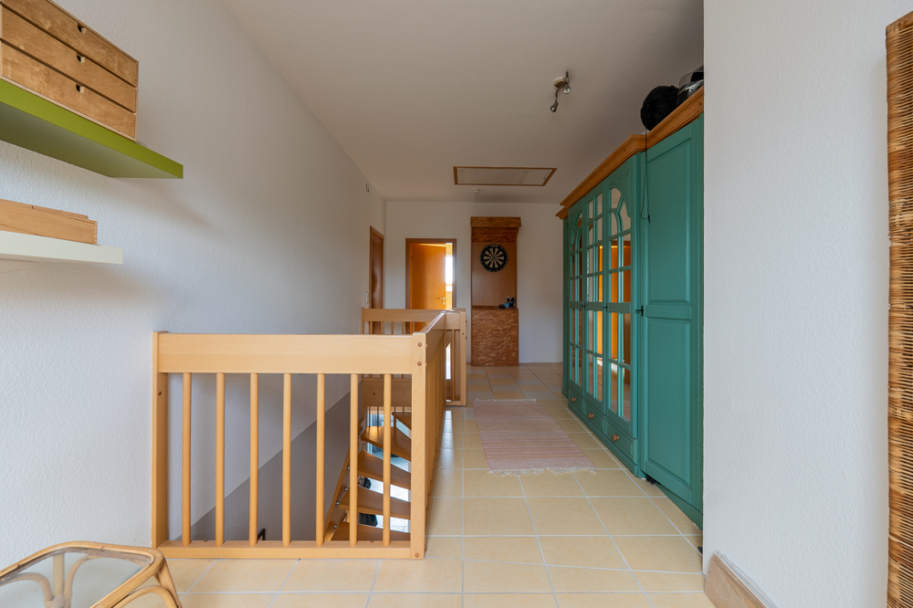 Im Obergeschoss setzt sich die Großzügigkeit des Hauses fort. Hier befinden sich ein Zimmer mit direktem Durchgang zu einem weiteren Raum – optimal als kombinierter Wohn- und Schlafbereich für Jugendliche –, ein kleines separates Zimmer, ein Badezimmer sowie ein sehr geräumiges Zimmer, das vielfältige Nutzungsmöglichkeiten bietet. Der Dachboden erstreckt sich über einen Teil des Hauses und bietet Stauraum.