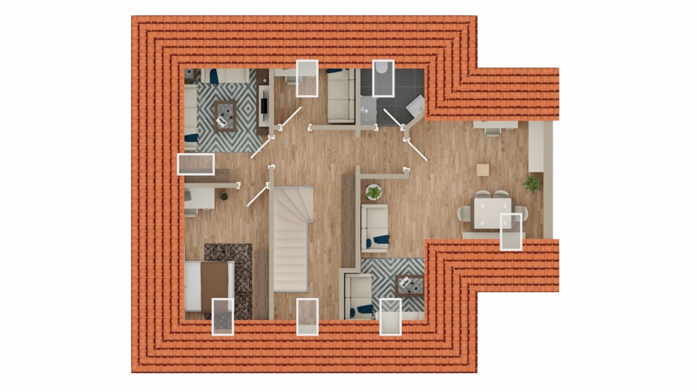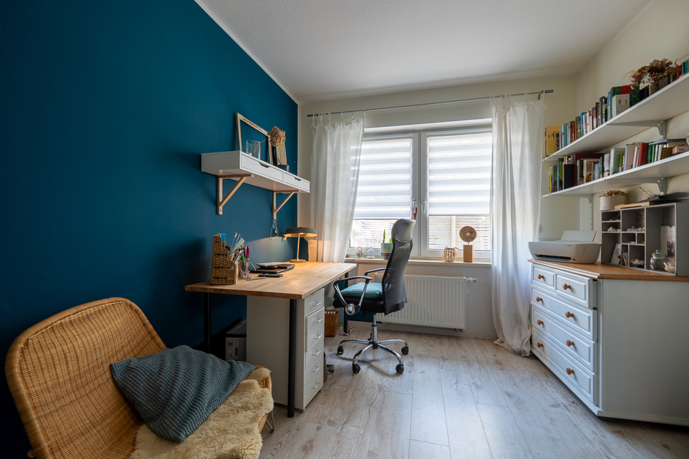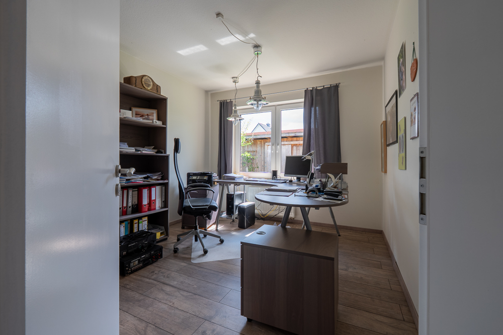 Beim Betreten des Hauses empfängt Sie ein großer, lichtdurchfluteter Eingangsbereich. Von hier aus gelangen Sie in sämtliche Wohnbereiche dieser Ebene: Ein Gäste-WC, ein Hauswirtschaftsraum sowie eine Speisekammer sorgen für funktionalen Komfort im Alltag. Die Küche, mit direktem Zugang zur überdachten Terrasse, ist durch eine Schiebetür mit dem angrenzenden Wohn- und Esszimmer verbunden – ideal für das Zusammensein mit Familie und Gästen. Zusätzlich stehen Ihnen ein Schlafzimmer, ein Badezimmer, ein Büro sowie ein weiteres Zimmer zur Verfügung, das sich beispielsweise als Kinder- oder Gästezimmer eignet.