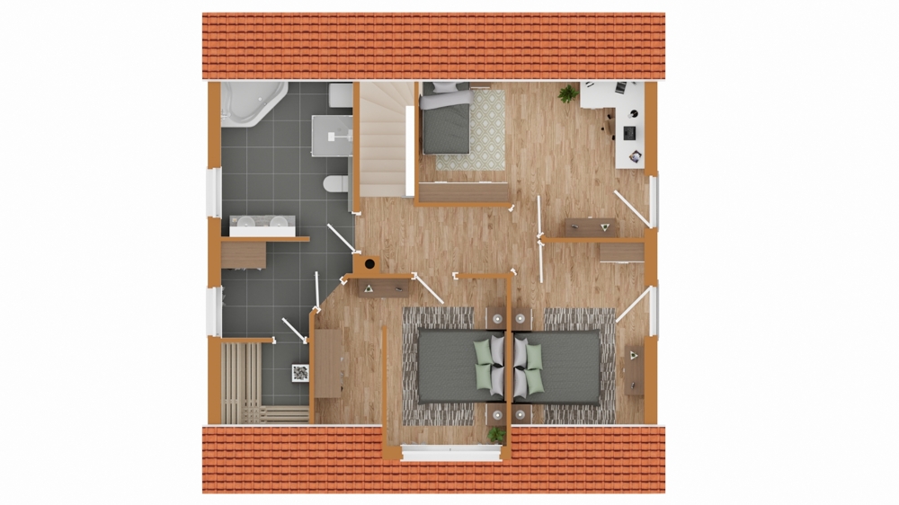 Im Obergeschoss finden sich zwei Zimmer die als Schlaf-, Arbeits-, Hobby- oder Gästezimmer genutzt werden können. Hinzu kommt ein großes Schlafzimmer mit Ankleidenische und direktem Zugang zu dem geräumigen, tageslichthellen Badezimmer.