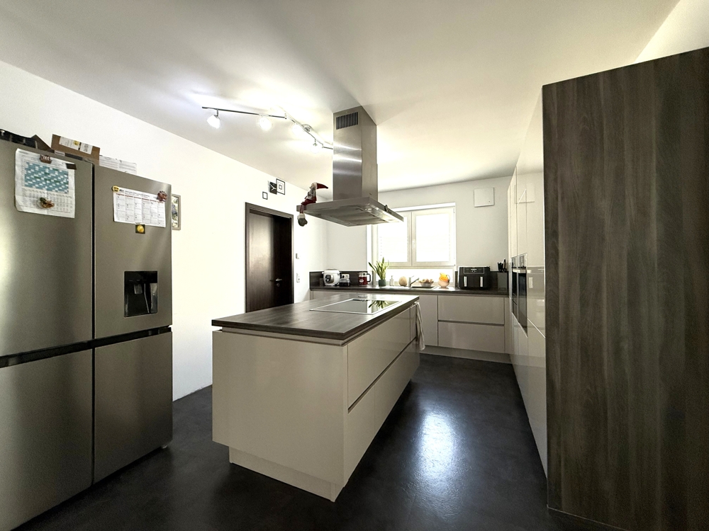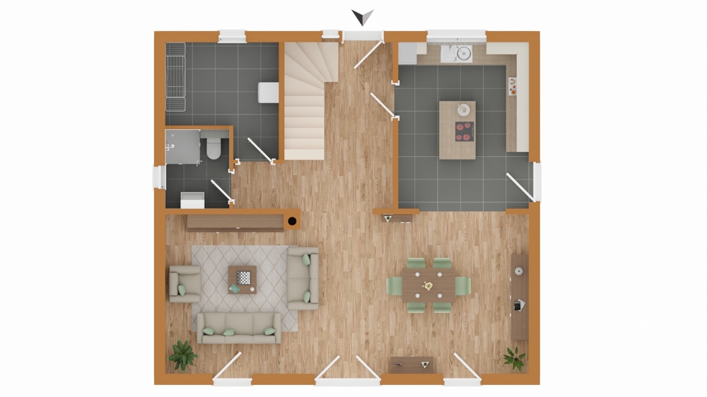Im Erdgeschoss öffnet sich der großzügige Wohn- und Essbereich mit Küche und Kochinsel. Große Fensterflächen lassen viel Tageslicht herein – das Herzstück des Hauses und Treffpunkt für Familie und Freunde. Ein Hauswirtschaftsraum und ein Gäste-WC ergänzen die Etage. Die Fußbodenheizung sorgt im gesamten Haus ganzjährig für ein behagliches Wohnklima.
