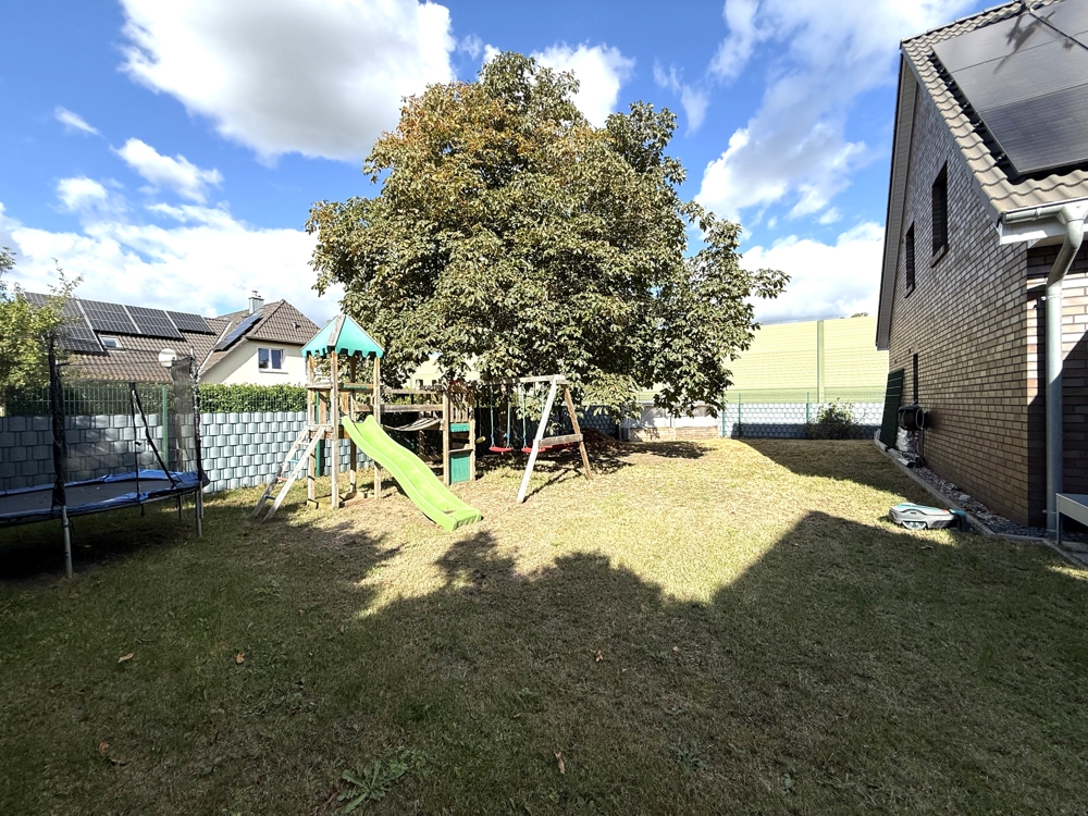 Das Gartengrundstück wurde liebevoll gestaltet und ist mit einem automatischen Bewässerungssystem ausgestattet – so bleibt der Garten auch in den Sommermonaten grün und gepflegt. Für Erfrischung sorgt der eigene Pool; die überdachte Terrasse lädt zu gemütlichen Stunden im Freien ein.