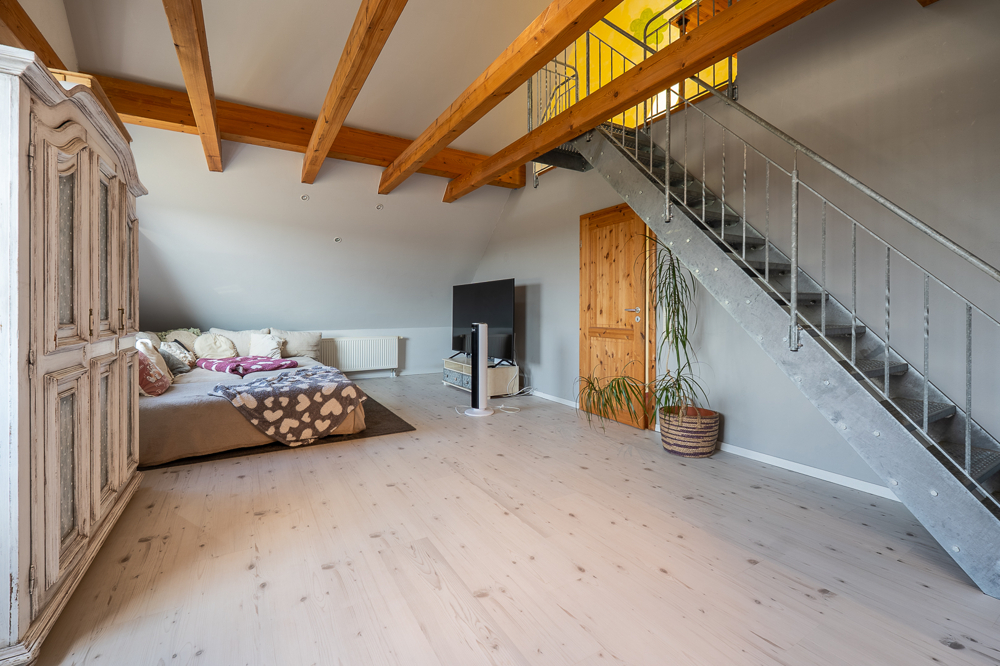 Im Obergeschoss erwarten Sie drei gut geschnittene Schlafzimmer, ein großzügiges Badezimmer sowie ein geräumiges Wohnzimmer mit Zugang zur offenen Empore im Dachgeschoss. Diese bietet zusätzlichen Platz für ein Homeoffice, ein Studio oder einen Hobbybereich – ein echtes Plus an Wohnqualität.