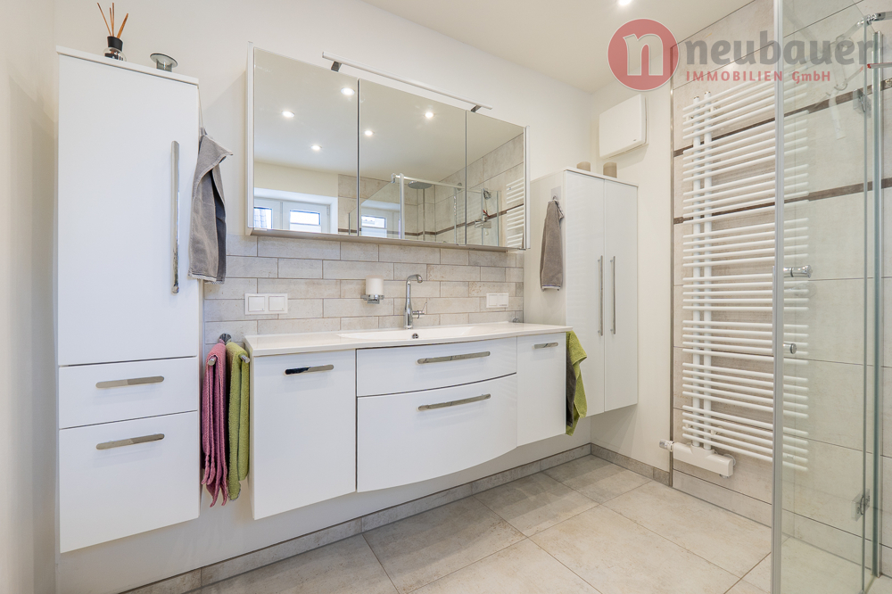 Die Obergeschosswohnung umfasst ebenfalls ca. 116 m² Wohnfläche, verteilt auf vier Zimmer. Der großzügige, vollständig überdachte Balkon mit Glasgeländern und Lärchenholzbelag schafft einen geschützten Außenbereich mit angenehmer Privatsphäre. Die Raumaufteilung ermöglicht sowohl klassische Wohnnutzung als auch flexible Konzepte wie Homeoffice oder Gästezimmer.