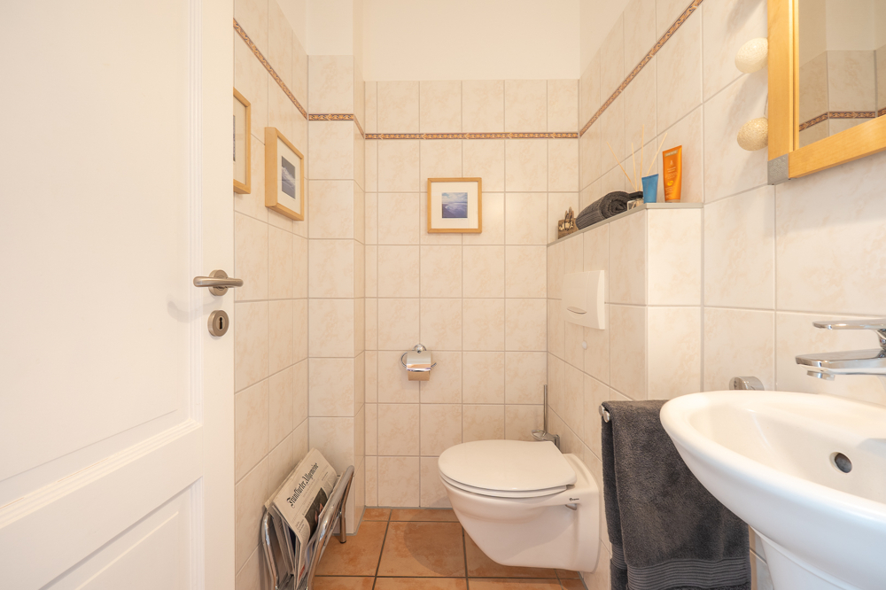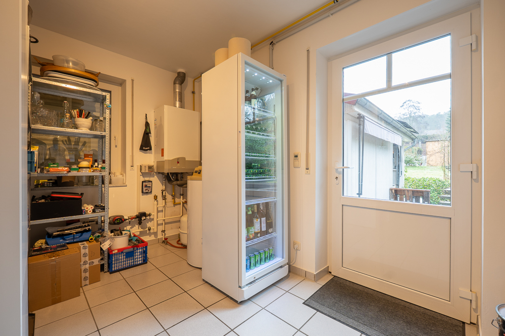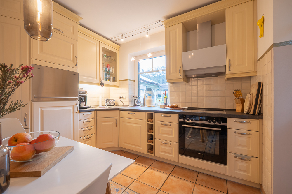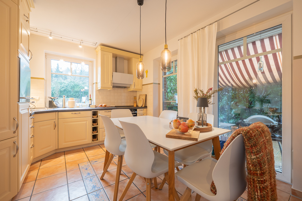 Bereits beim Betreten des Hauses wird deutlich, wie hell und einladend es ist. Die großzügige Diele beeindruckt durch große Fenster und ein offenes Raumgefühl. Von hier aus gelangt man in das Gäste-WC sowie in die schöne Küche, die ausreichend Platz für gemeinsames Kochen bietet; der praktische Hauswirtschaftsraum ist direkt von hier aus zugänglich. Durch eine Doppeltür öffnet sich das Herzstück des Hauses: das großzügige Wohn- und Esszimmer mit bodentiefen Fenstern. Ein Kamin sorgt für eine gemütliche Atmosphäre, während ein kleiner Erker zusätzlichen Charme verleiht. Sowohl von der Küche als auch vom Wohn- und Esszimmer aus erreicht man die Terrasse, die sich entlang des Hauses erstreckt und einen harmonischen Übergang in den Garten schafft.