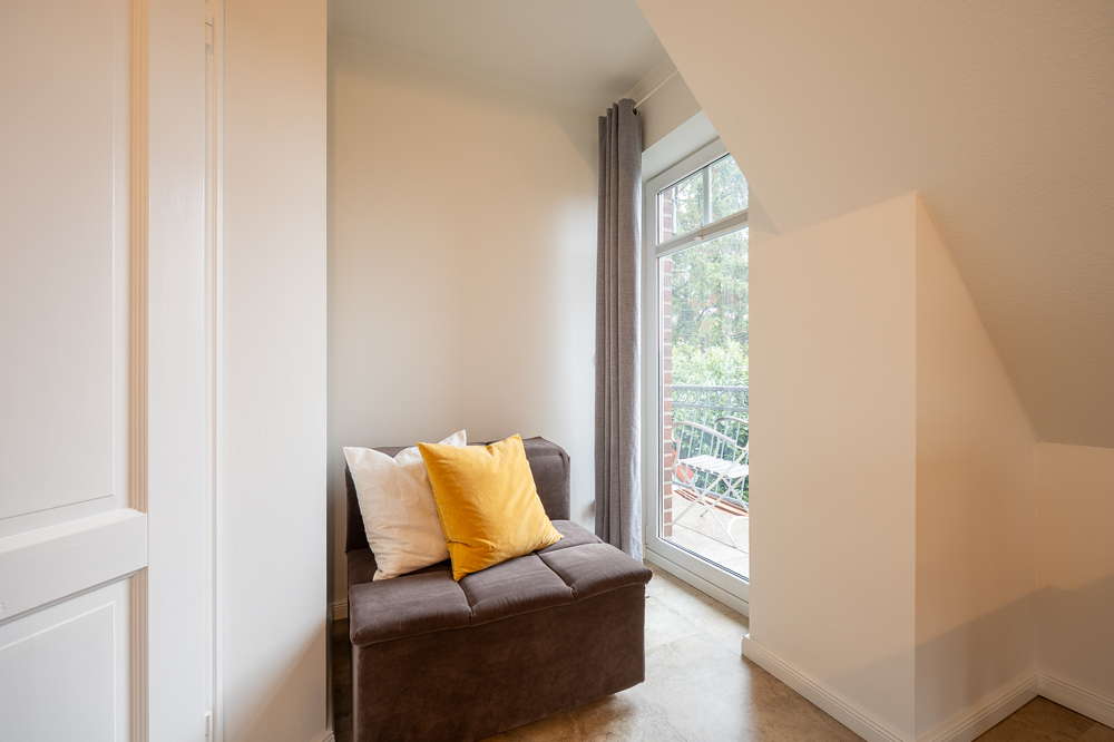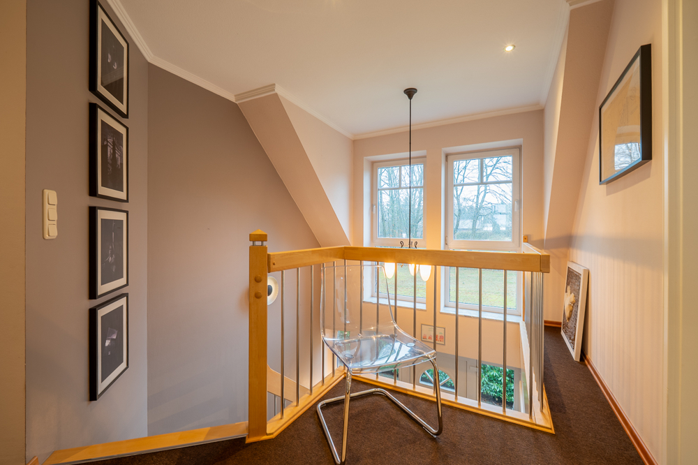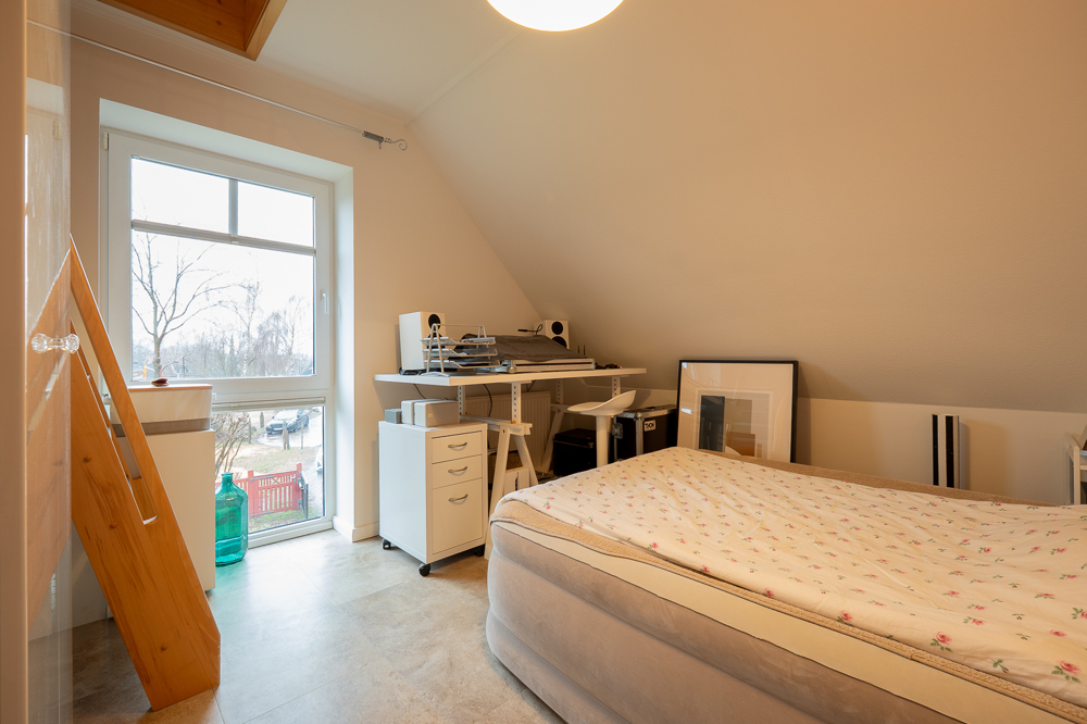 Über die Treppe erreicht man das Obergeschoss. Hier befinden sich ein geräumiges Badezimmer sowie drei gut geschnittene Zimmer, die flexibel als Schlaf-, Kinder- oder Arbeitszimmer genutzt werden können. Zwei der Zimmer verfügen über einen Zugang zu einem kleinen Balkon. Von einem der Räume aus führt eine weitere Treppe in das wohnlich ausgebaute Dachgeschoss, das zusätzlichen Platz für Rückzug oder kreative Ideen schafft. Der übrige Dachboden ist nicht ausgebaut und bietet praktischen Stauraum.