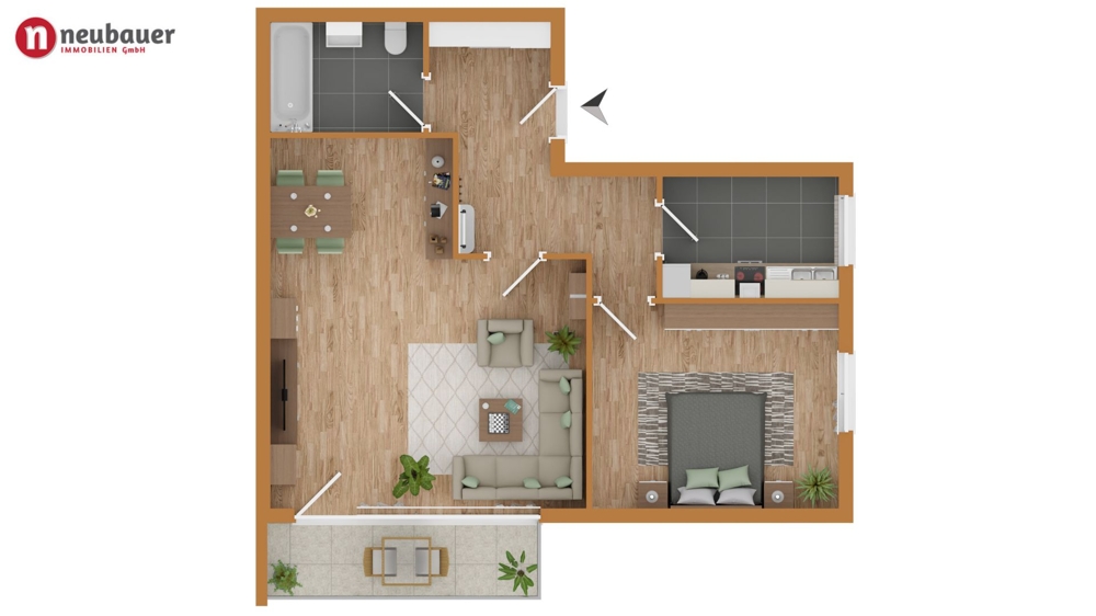 Das großzügige Wohn- und Esszimmer bildet den Mittelpunkt der Wohnung. Durch die große Fensterfront wirkt der Raum besonders hell und freundlich. Von hier aus gelangen Sie direkt auf den Südbalkon, welcher den Wohnraum angenehm erweitert. Das geräumige Schlafzimmer bietet ausreichend Platz für individuelle Einrichtungsideen. Ergänzt wird das Raumangebot durch eine separate Küche.