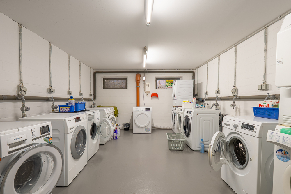 Im Kellergeschoss profitieren Bewohner von gemeinschaftlichen Wasch- und Trockenräumen. Zusätzlich gehört ein eigener Kellerraum zur Wohnung, der weiteren Stauraum bietet.