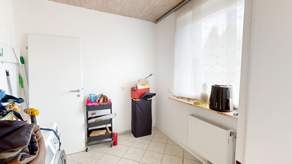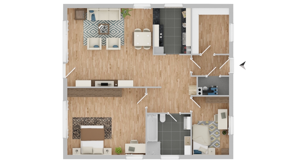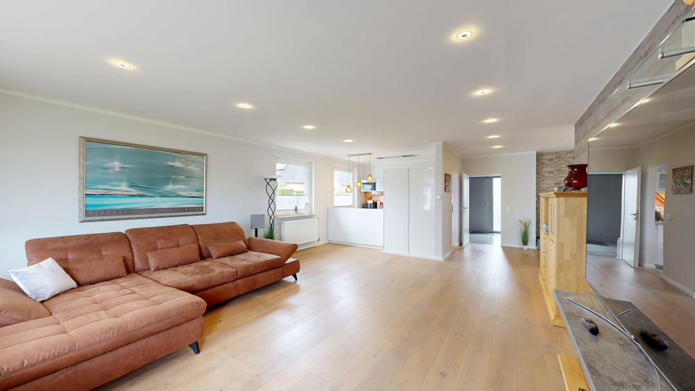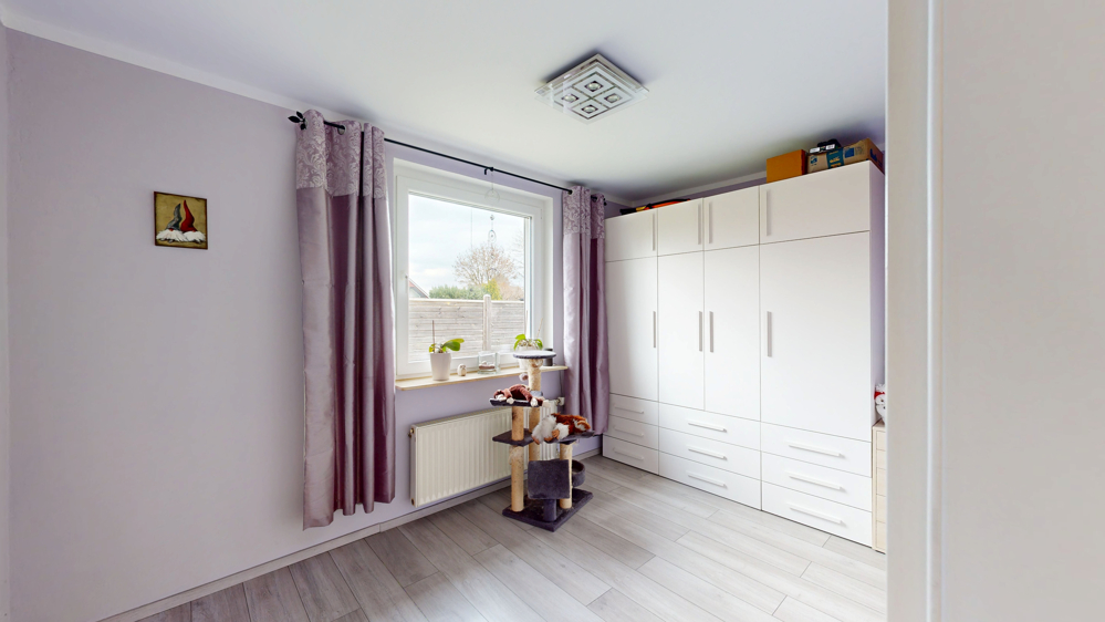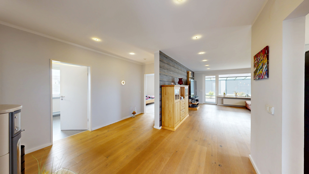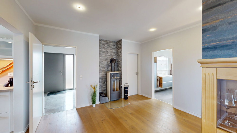 Beim Betreten des Hauses gelangen Sie zuerst in den Flur, von dem der Heizungsraum sowie der praktische Abstellraum abgeht. Die offene Wohnlandschaft bildet das Herzstück des Hauses: Ein riesiger Wohn- und Essbereich bietet viel Platz für gesellige Stunden, die offene Küche ist diesem Bereich angeschlossen. Vom Wohnbereich aus erreichen Sie außerdem ein Zimmer, das sich ideal als Büro, Gäste- oder Kinderzimmer nutzen lässt sowie das großzügige Badezimmer und das geräumige Schlafzimmer. Ein weiteres Highlight ist der Kamin im Wohnbereich, der in den kälteren Monaten für eine gemütliche Atmosphäre sorgt.