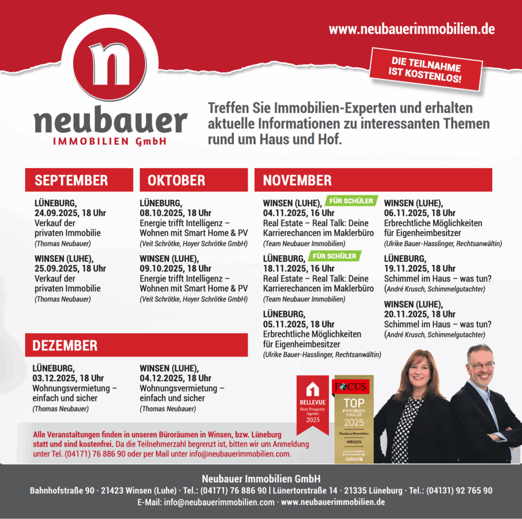 Ob Verkauf, Vermietung, Energie oder Recht – wir bringen Expertenwissen kompakt und verständlich auf den Punkt. Erleben Sie praxisnahe Vorträge in Lüneburg und Winsen, kostenlos und mit echtem Mehrwert.